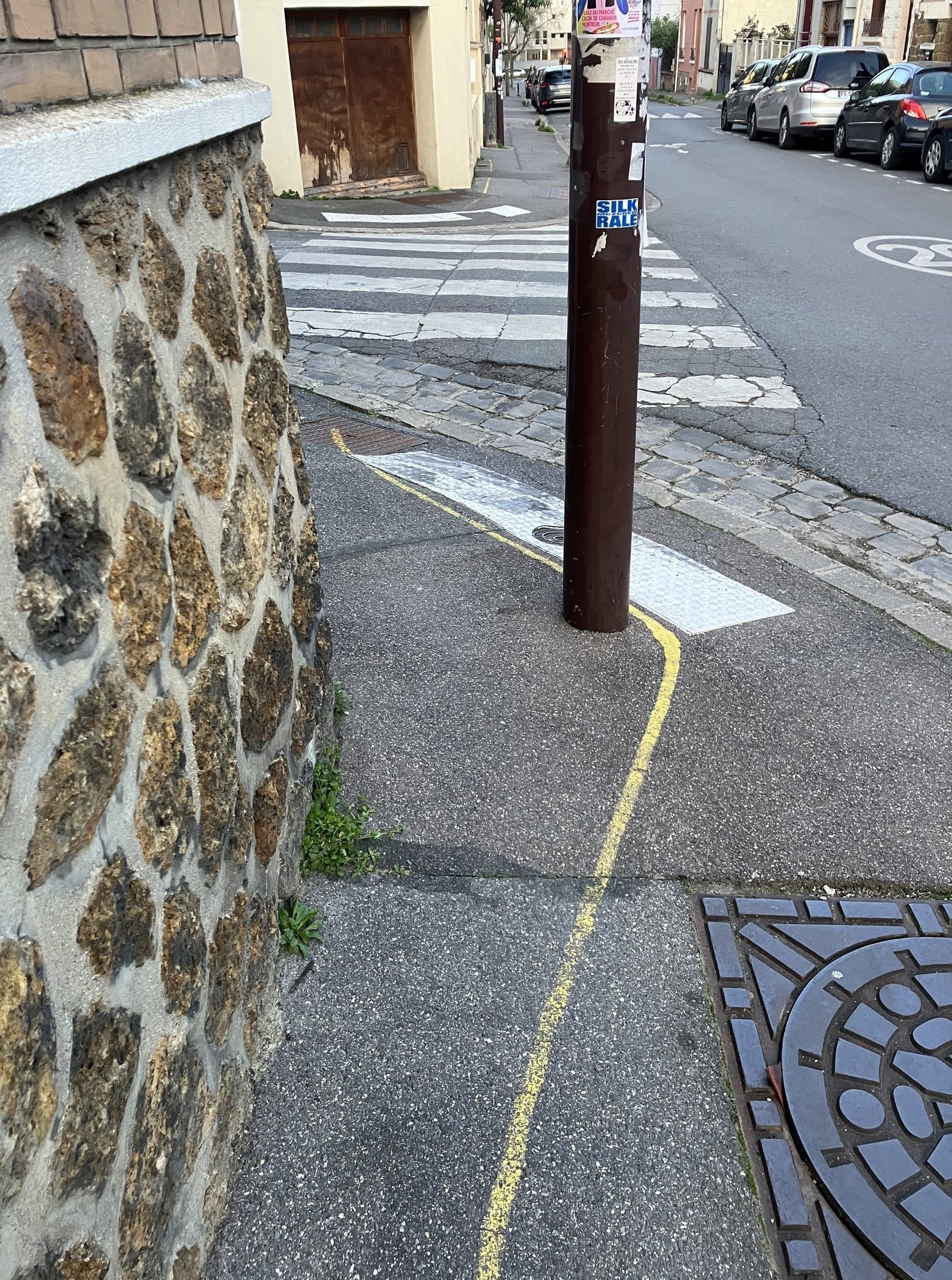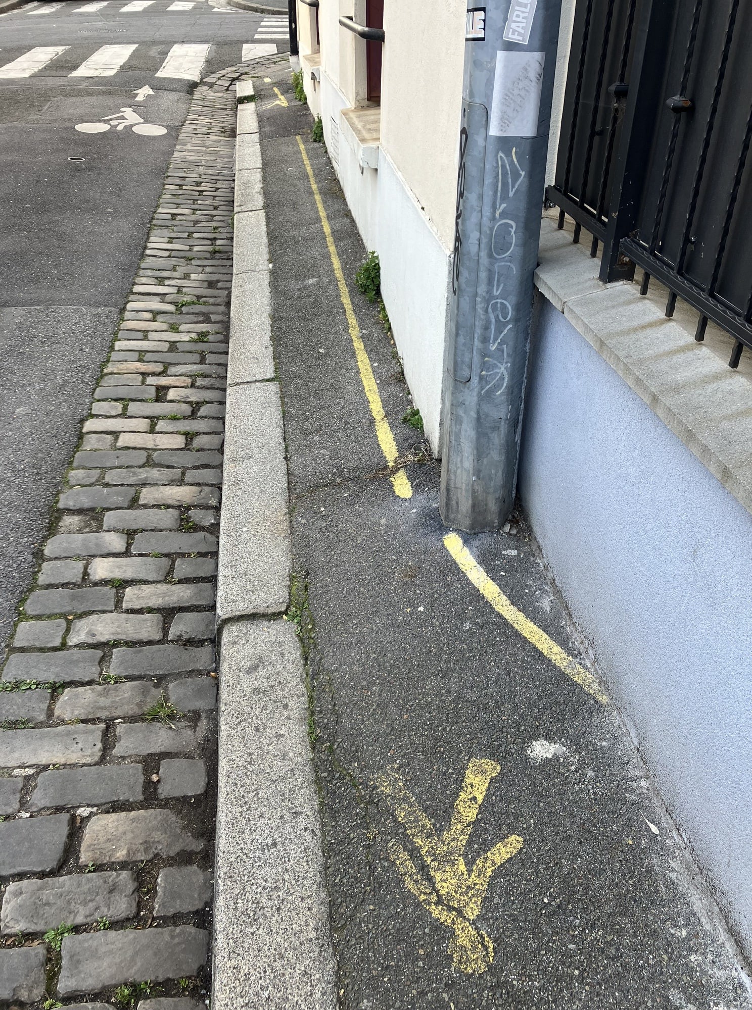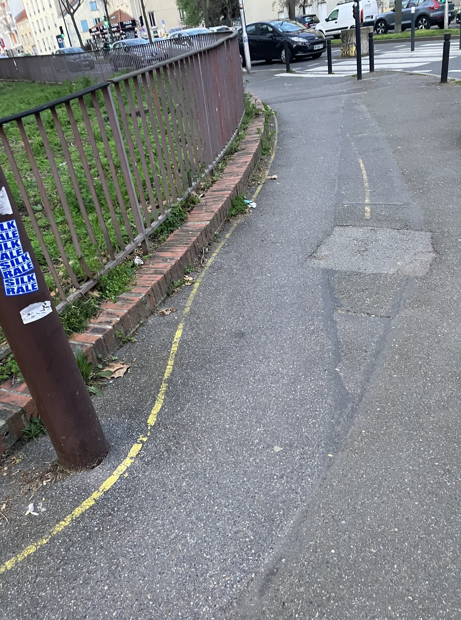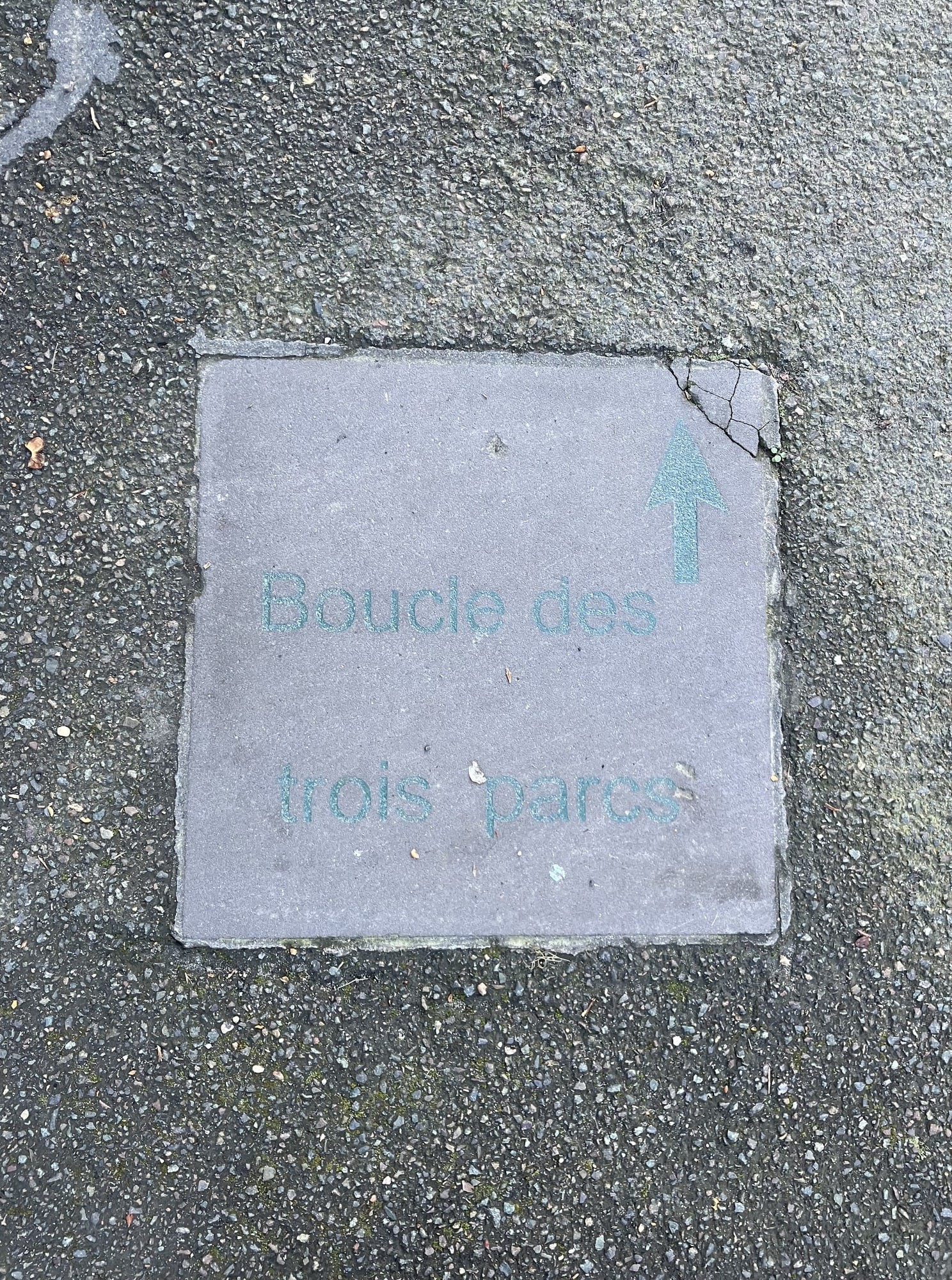 Il y a quelques temps je suis retombé sur un signe urbain que j’avais remarqué il y a dix ans quand je m’étais installé à Montreuil, sur lequel je m’étais un peu renseigné, mais je n’avais pas creusé plus loin. Le signe en question, c’est une ligne jaune, présente sur de nombreux trottoirs de la ville, et qui marquent une proposition de chemin : la Boucle des Trois Parcs.