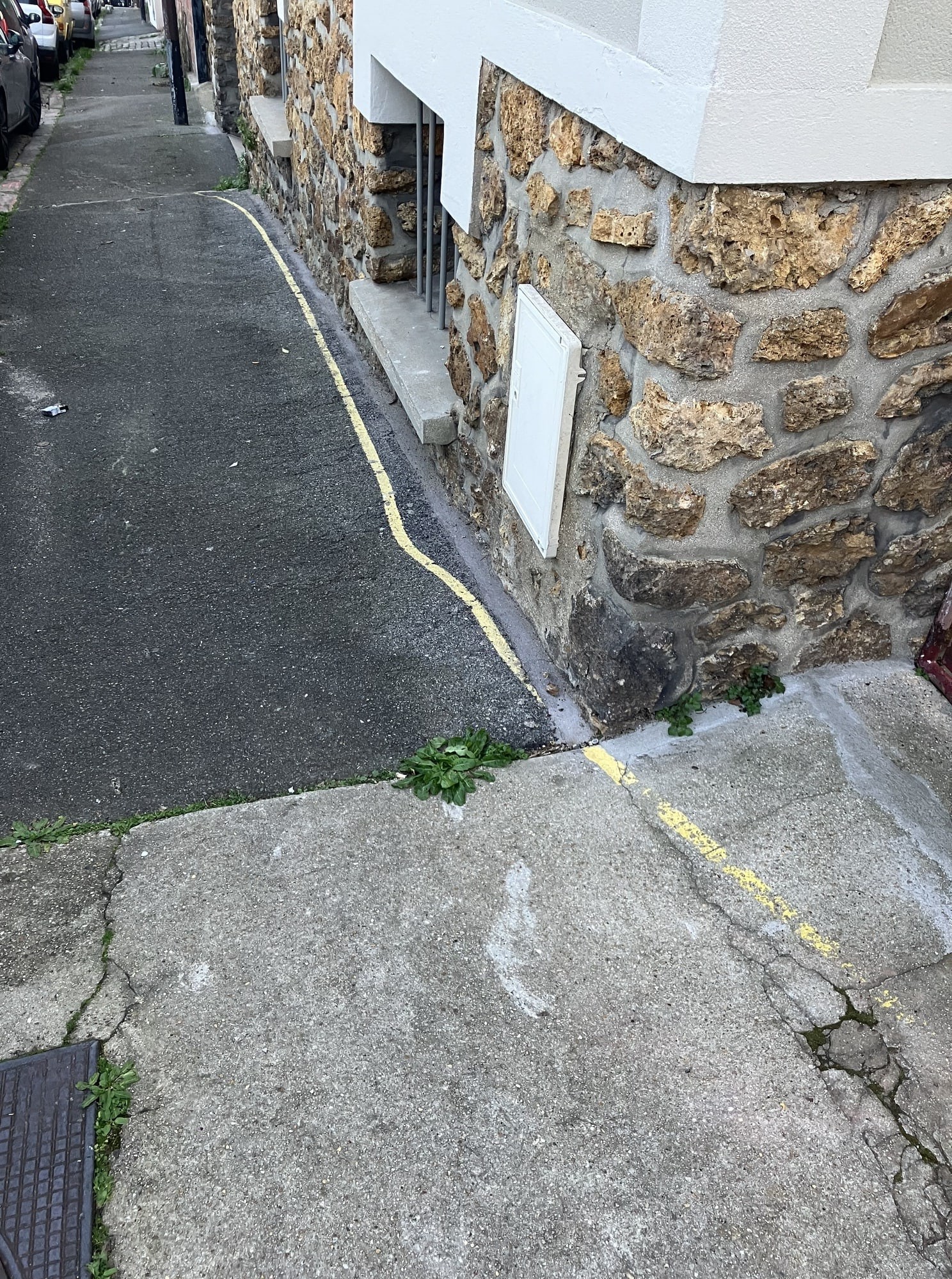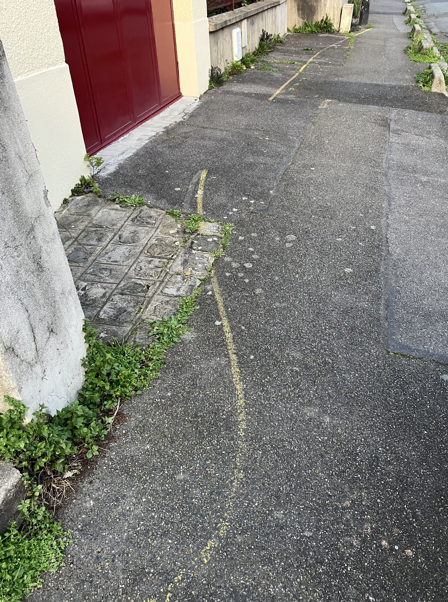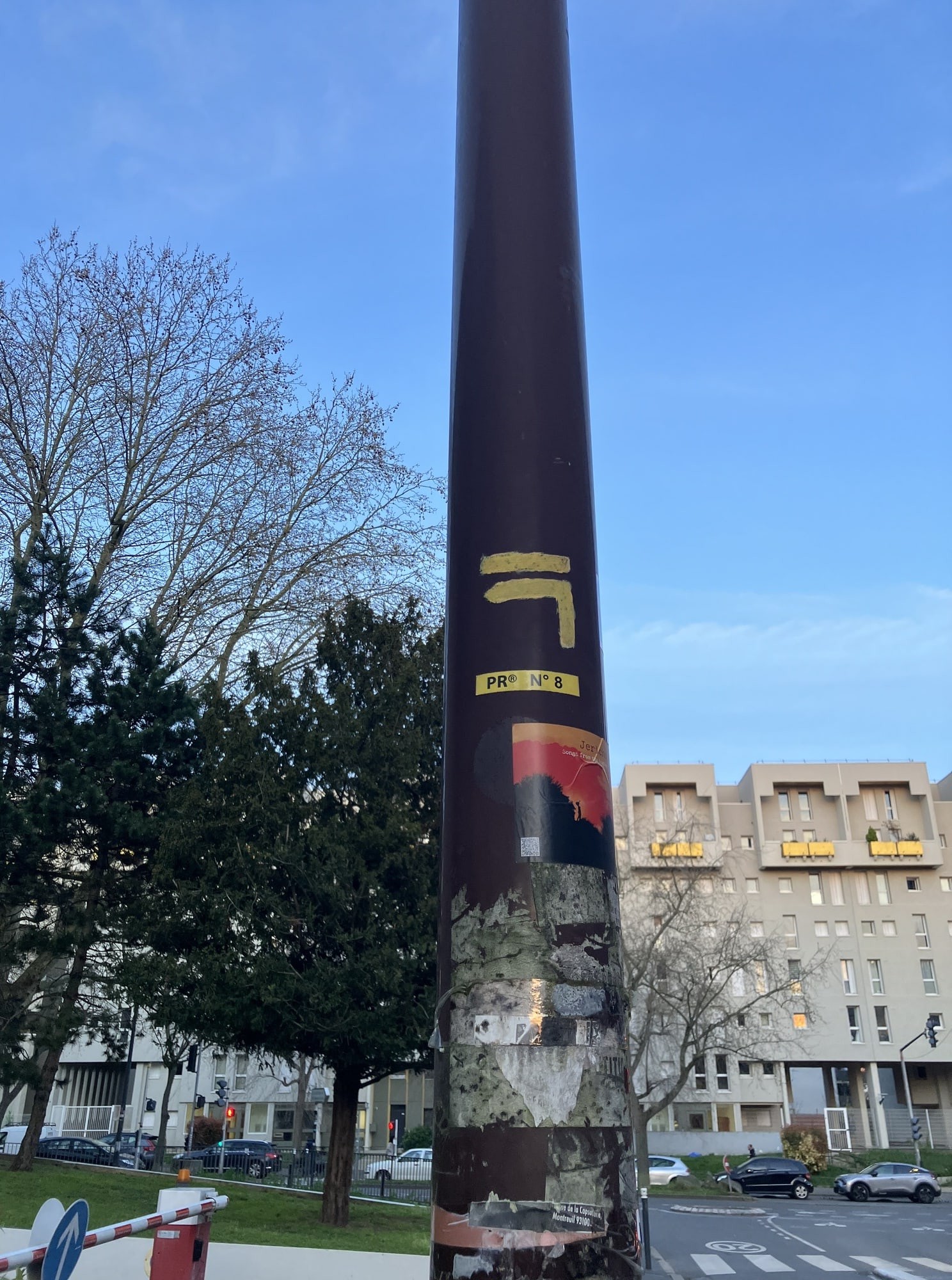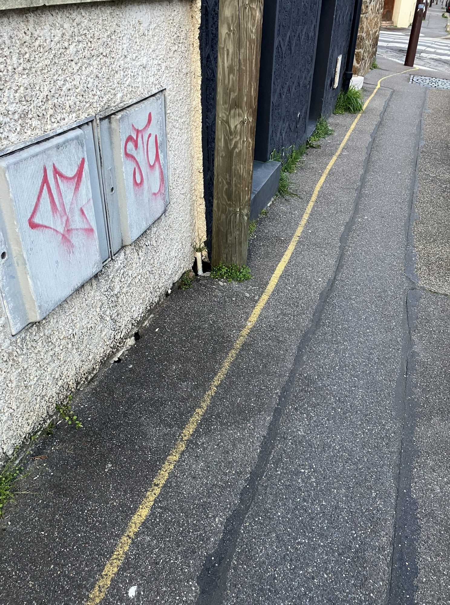 Depuis son premier marquage, la ligne de peinture jaune a eu le temps de s’user, les trottoirs d’être refaits, la trace de s’estomper. Mais pour aider il y a aussi des signes de direction sur les murs, arbres et poteaux en chemin (c’est les signes classiques de la FFRandonnée : un trait horizontal pour indiquer la bonne direction, un trait horizontal au dessus d’un coude pour annoncer un changement de direction, et une croix à 45° pour prévenir d’une mauvaise direction).
