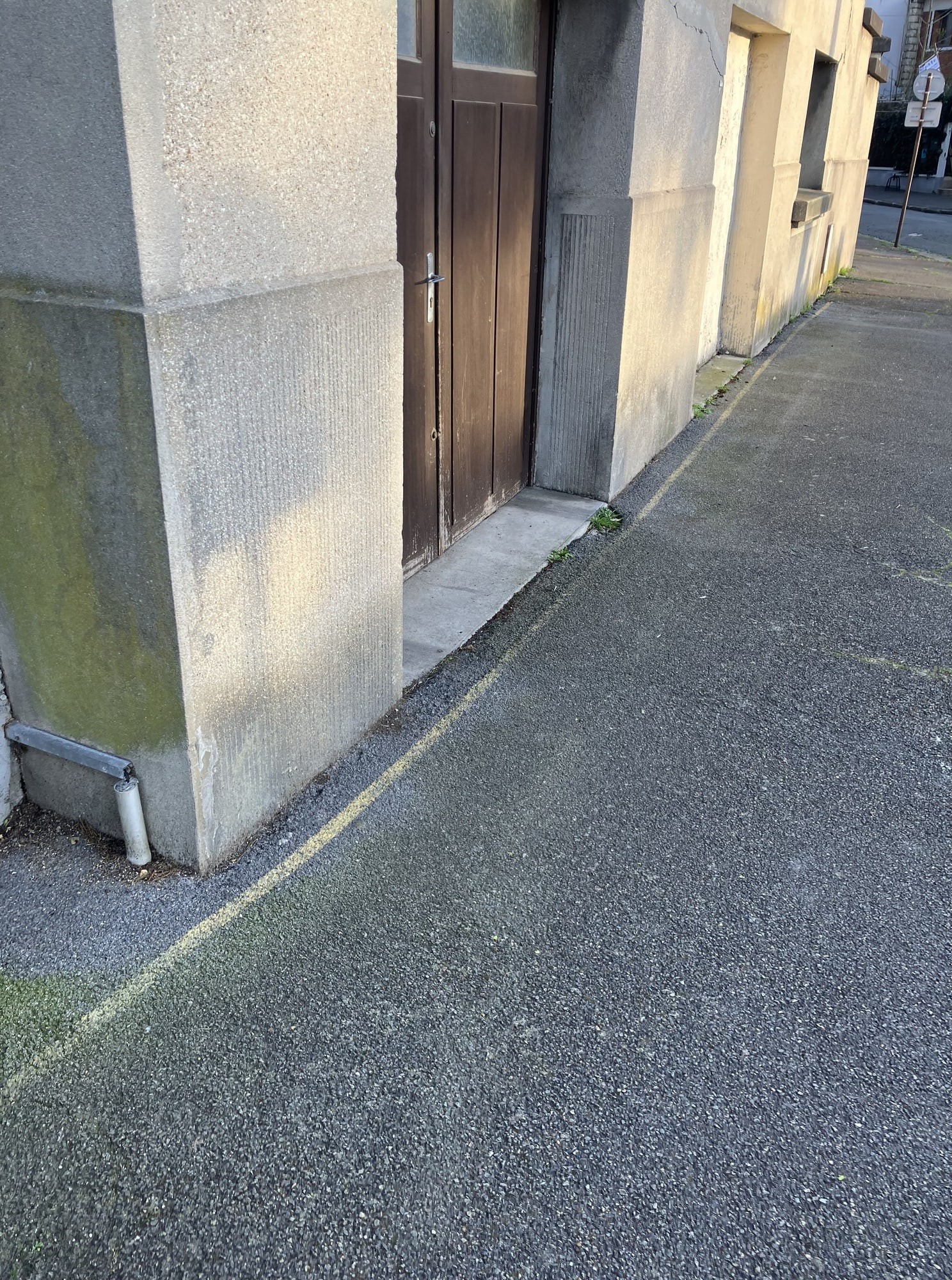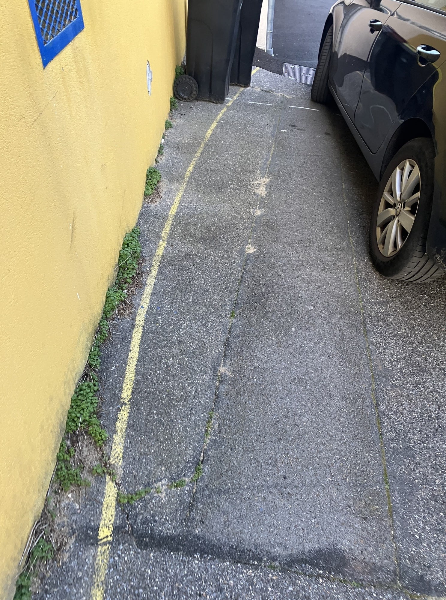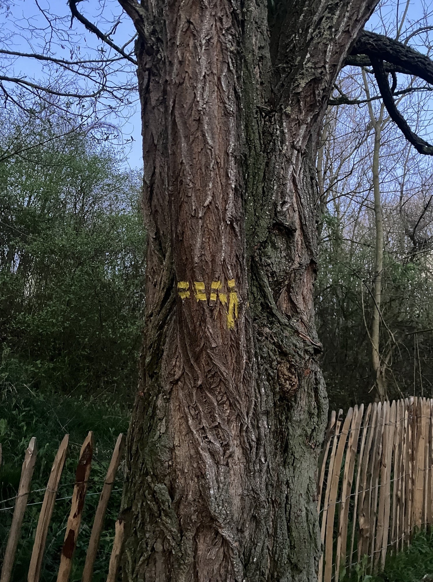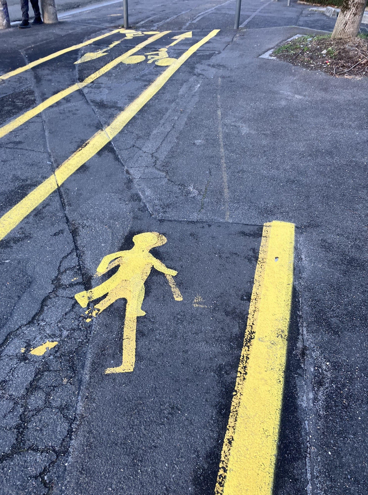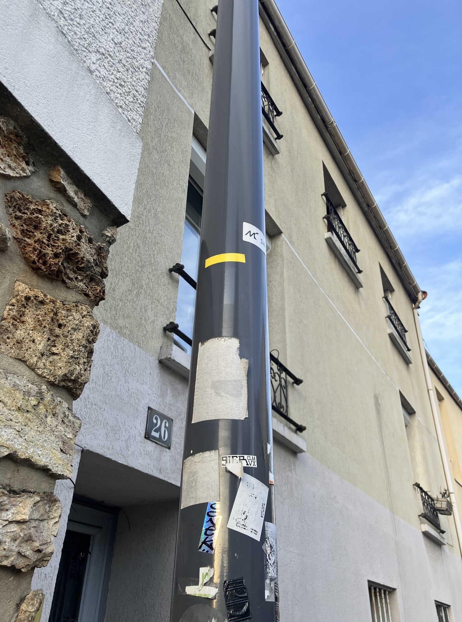 Depuis son premier marquage, la ligne de peinture jaune a eu le temps de s’user, les trottoirs d’être refaits, la trace de s’estomper. Mais pour aider il y a aussi des signes de direction sur les murs, arbres et poteaux en chemin (c’est les signes classiques de la FFRandonnée : un trait horizontal pour indiquer la bonne direction, un trait horizontal au dessus d’un coude pour annoncer un changement de direction, et une croix à 45° pour prévenir d’une mauvaise direction).