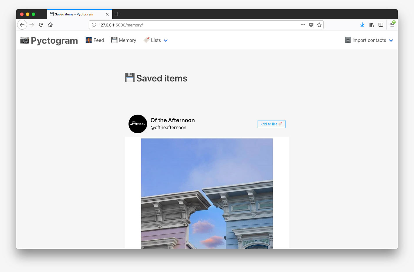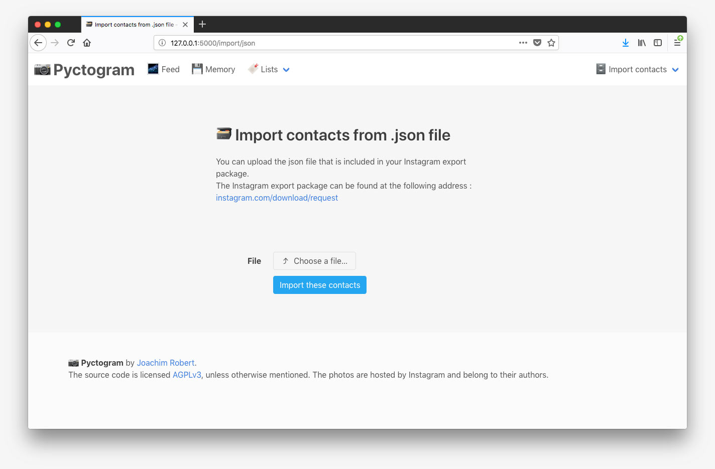 J’aimerais aussi pouvoir gérer plusieurs utilisateurs sur la même installation. C’est pas la partie la plus facile (surtout au niveau sécurité). De même pour savoir comment concevoir le rapatriement des médias. Le script pourrait être appelé tous les jours (via une action automatisée, comme cron), mais j’aimerais pouvoir déclencher le rapatriement depuis l’interface web. À 800 contacts, ça met 20 minutes, c’est pas jouable. Ou bien j’améliore le scraper (trois requêtes à la fois ?) ce qui pourrait me pénaliser auprès d’Instagram (ce genre de requêtes automatisées, c’est jamais très bien vu), ou je trouve le moyen d’exécuter le rapatriement en tâche de fond, avec une barre de progression—mais ça c’est une partie de JS et de requêtes que je ne maitrise absolument pas.