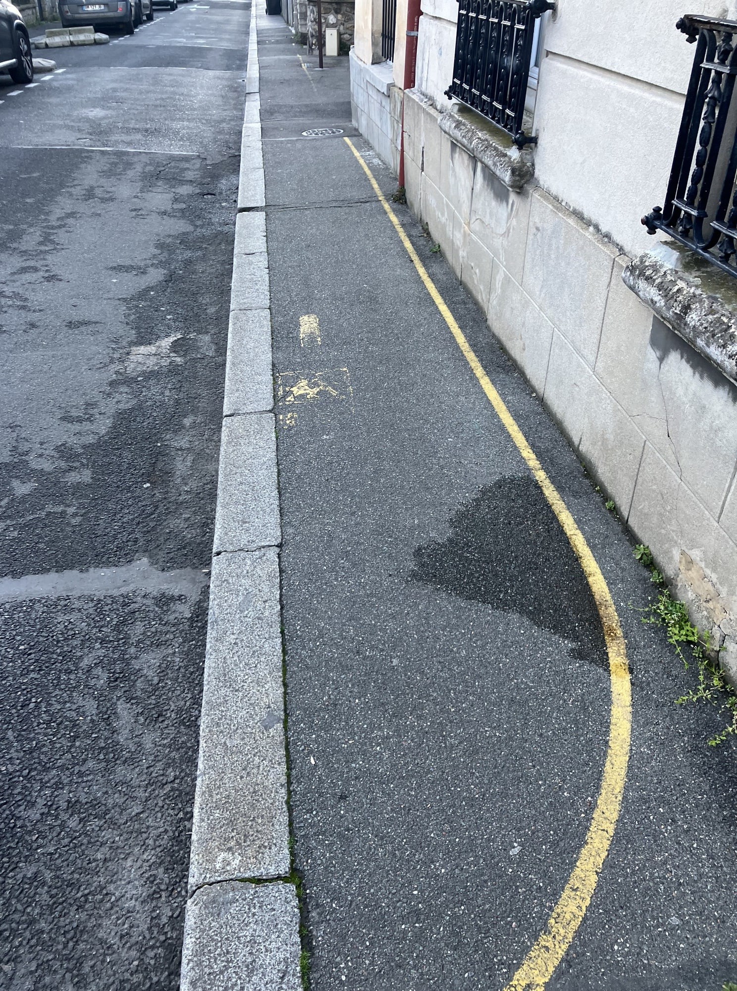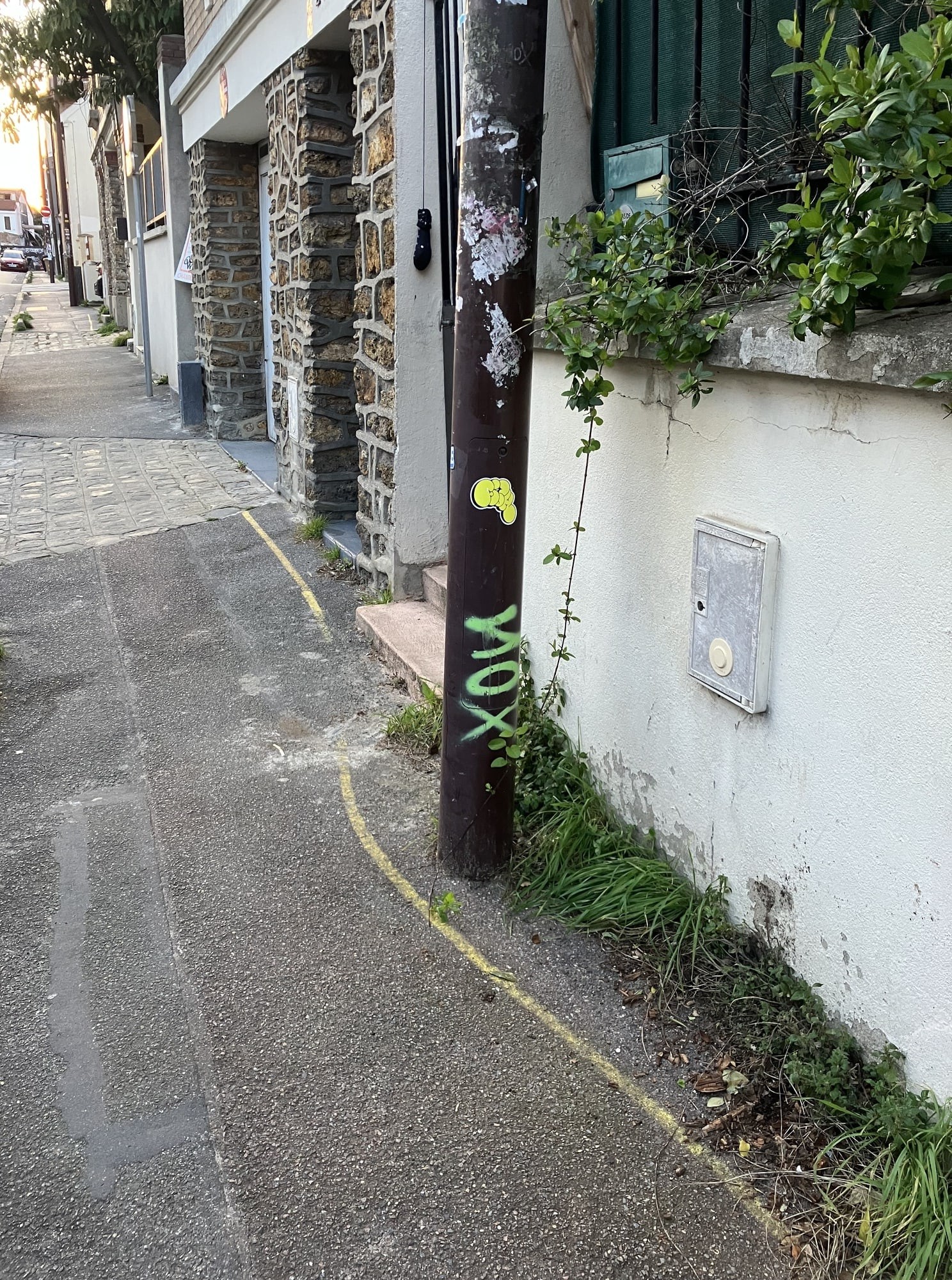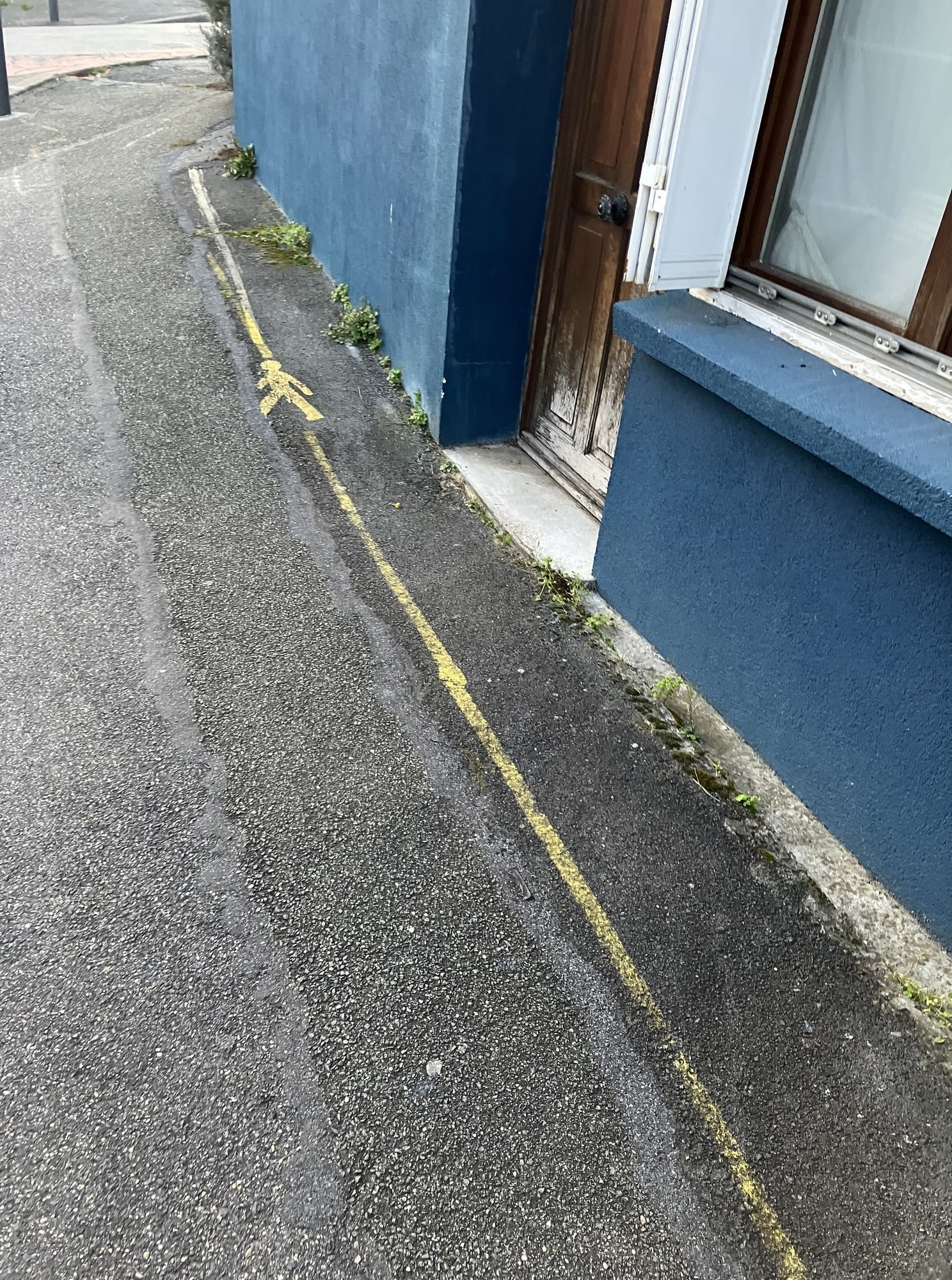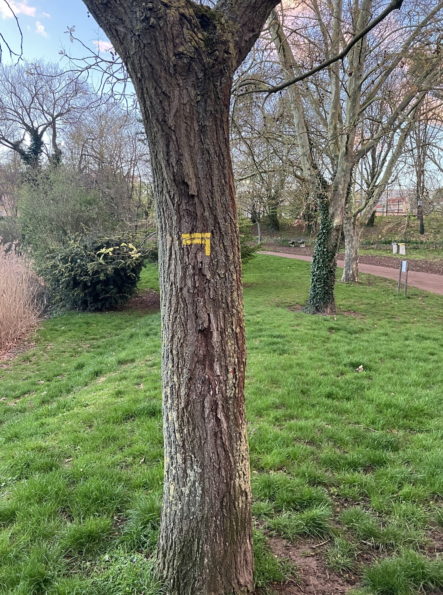 Depuis son premier marquage, la ligne de peinture jaune a eu le temps de s’user, les trottoirs d’être refaits, la trace de s’estomper. Mais pour aider il y a aussi des signes de direction sur les murs, arbres et poteaux en chemin (c’est les signes classiques de la FFRandonnée : un trait horizontal pour indiquer la bonne direction, un trait horizontal au dessus d’un coude pour annoncer un changement de direction, et une croix à 45° pour prévenir d’une mauvaise direction).