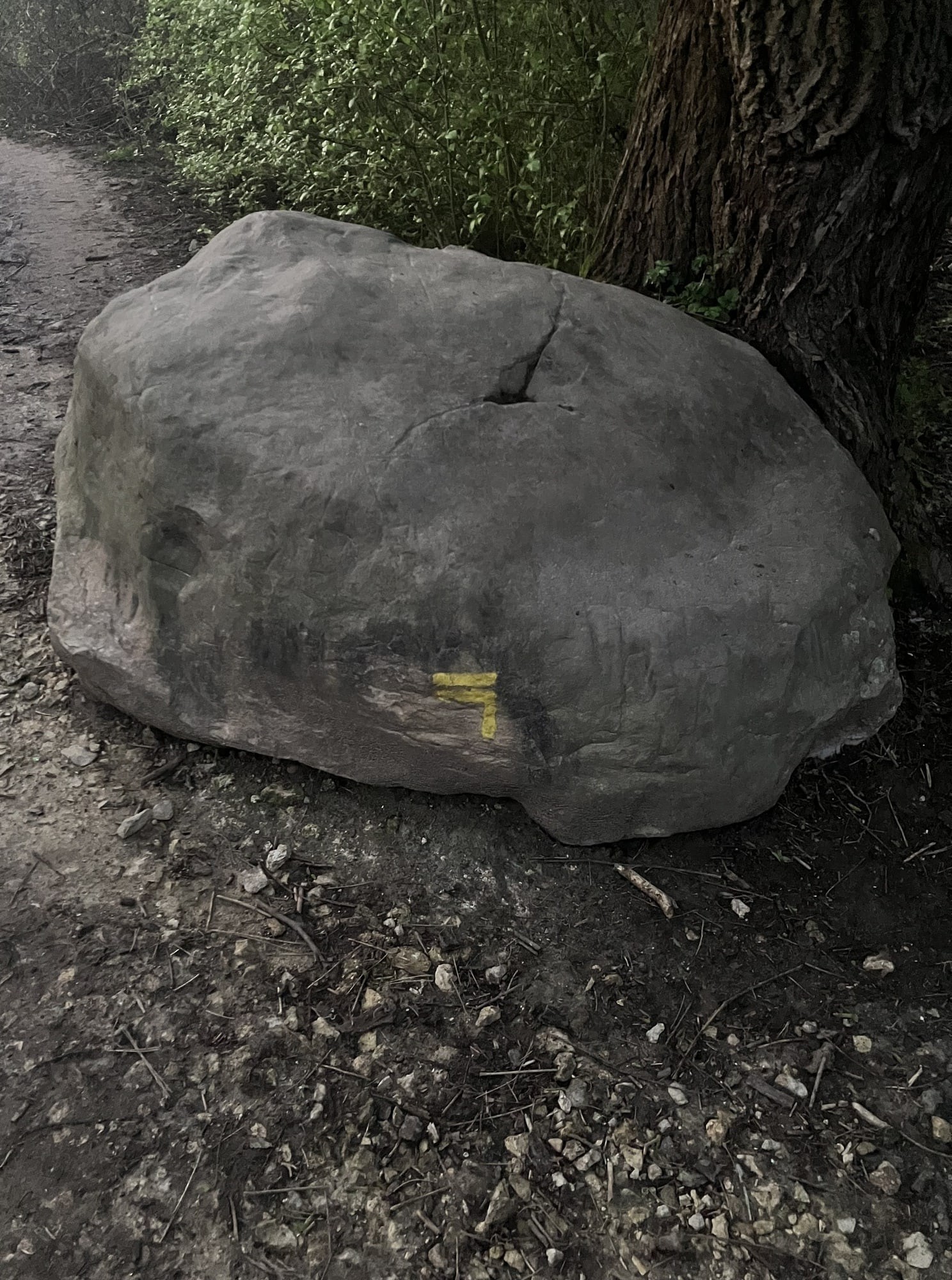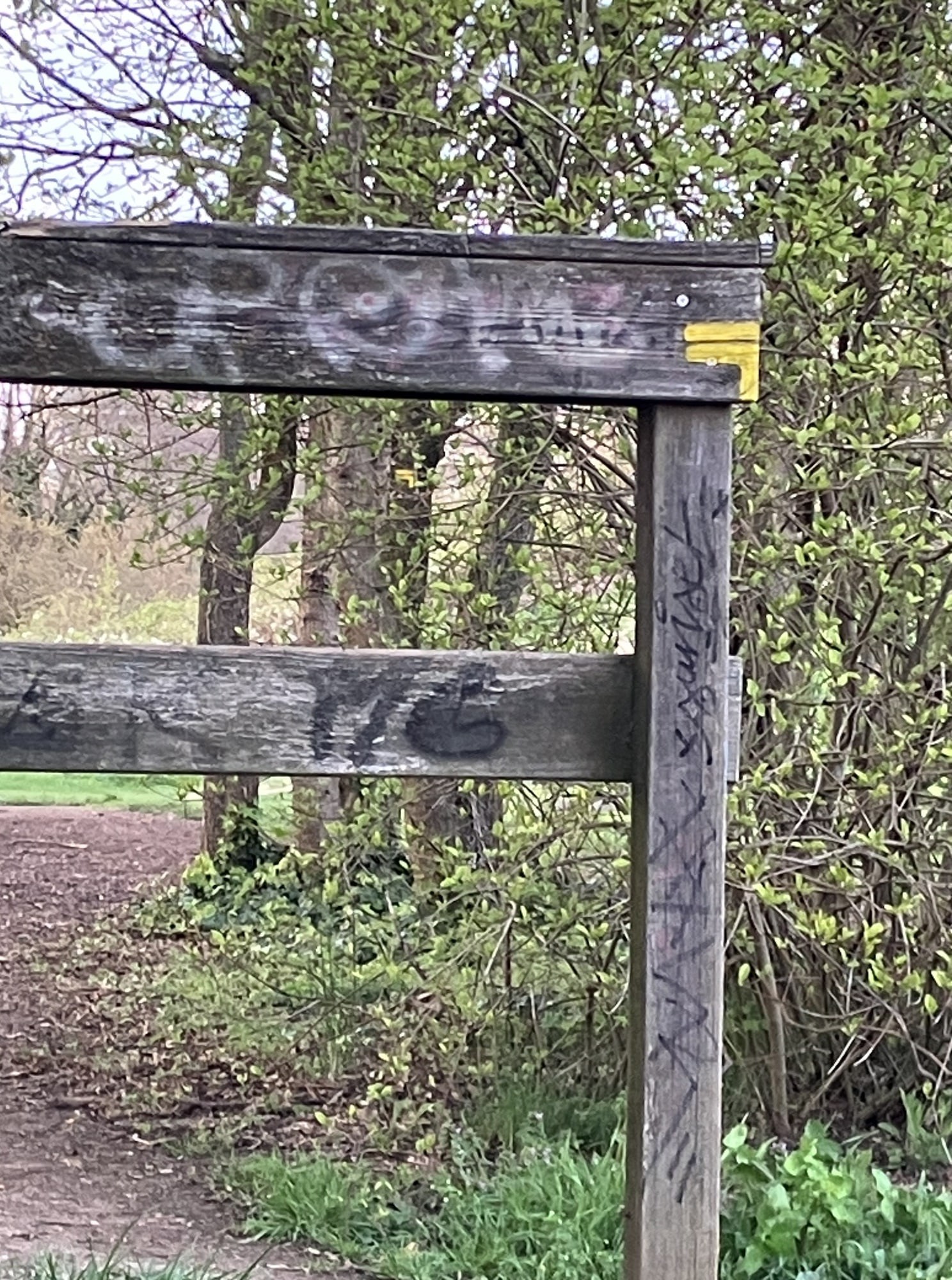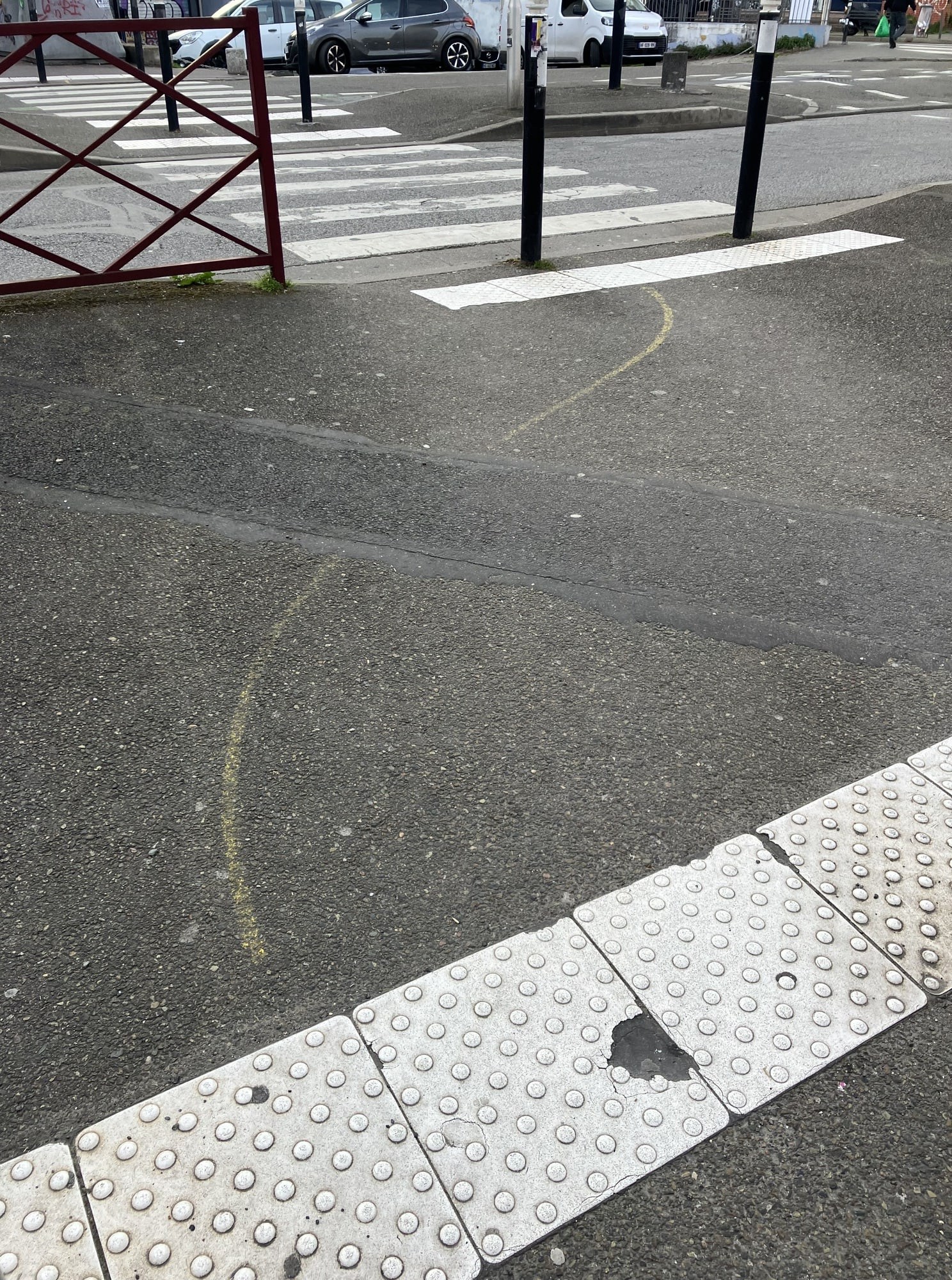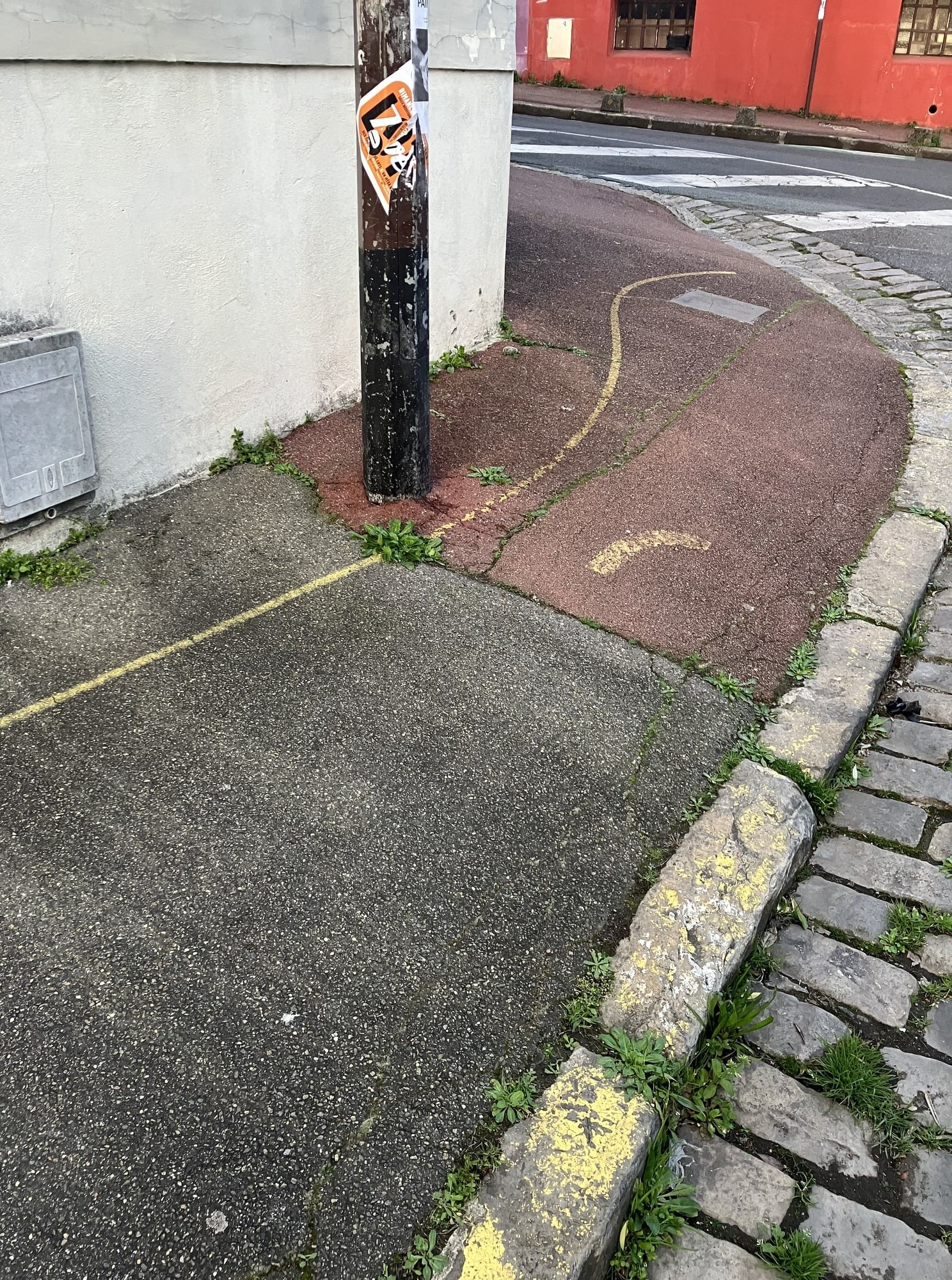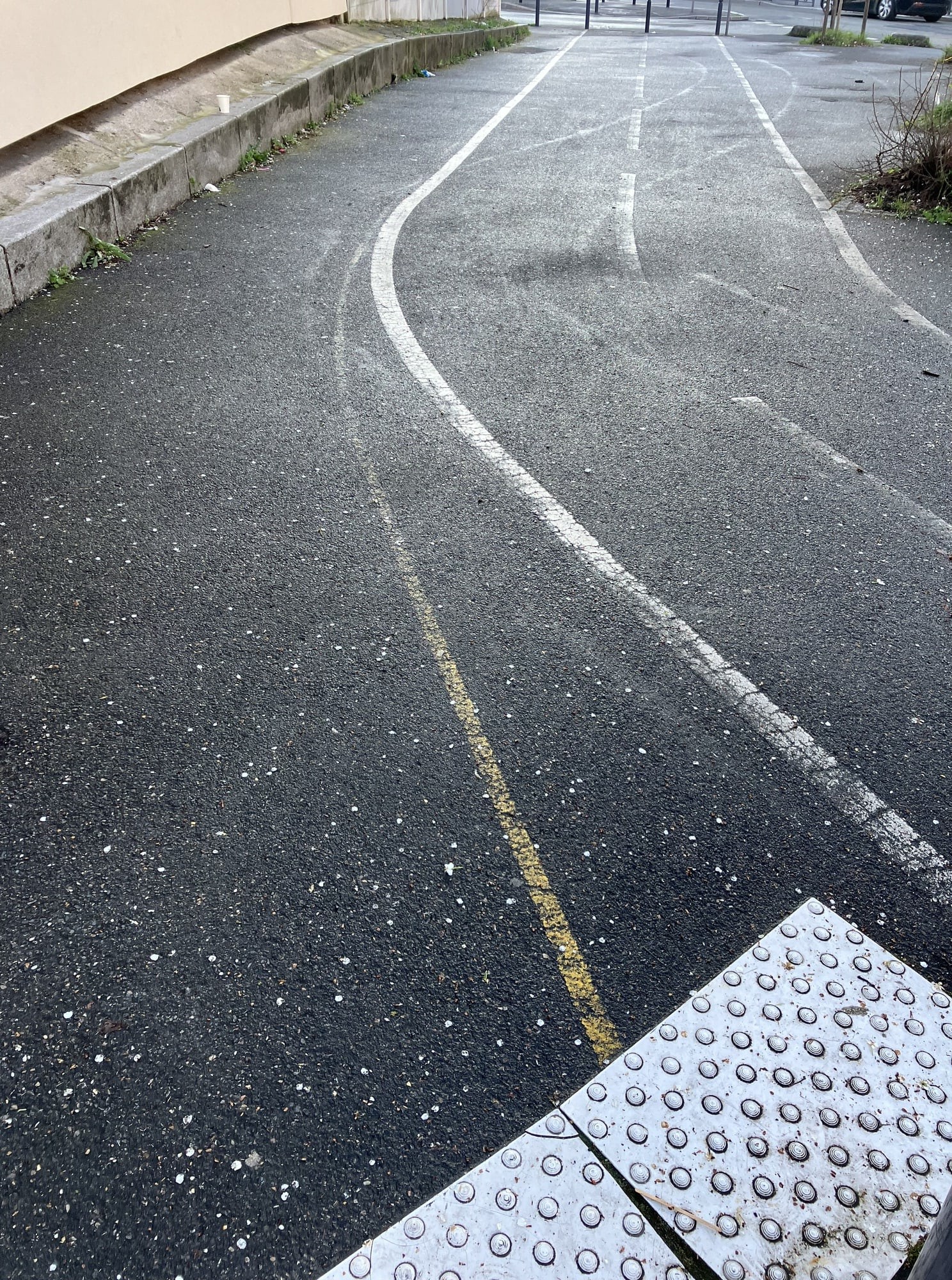 Depuis son premier marquage, la ligne de peinture jaune a eu le temps de s’user, les trottoirs d’être refaits, la trace de s’estomper. Mais pour aider il y a aussi des signes de direction sur les murs, arbres et poteaux en chemin (c’est les signes classiques de la FFRandonnée : un trait horizontal pour indiquer la bonne direction, un trait horizontal au dessus d’un coude pour annoncer un changement de direction, et une croix à 45° pour prévenir d’une mauvaise direction).