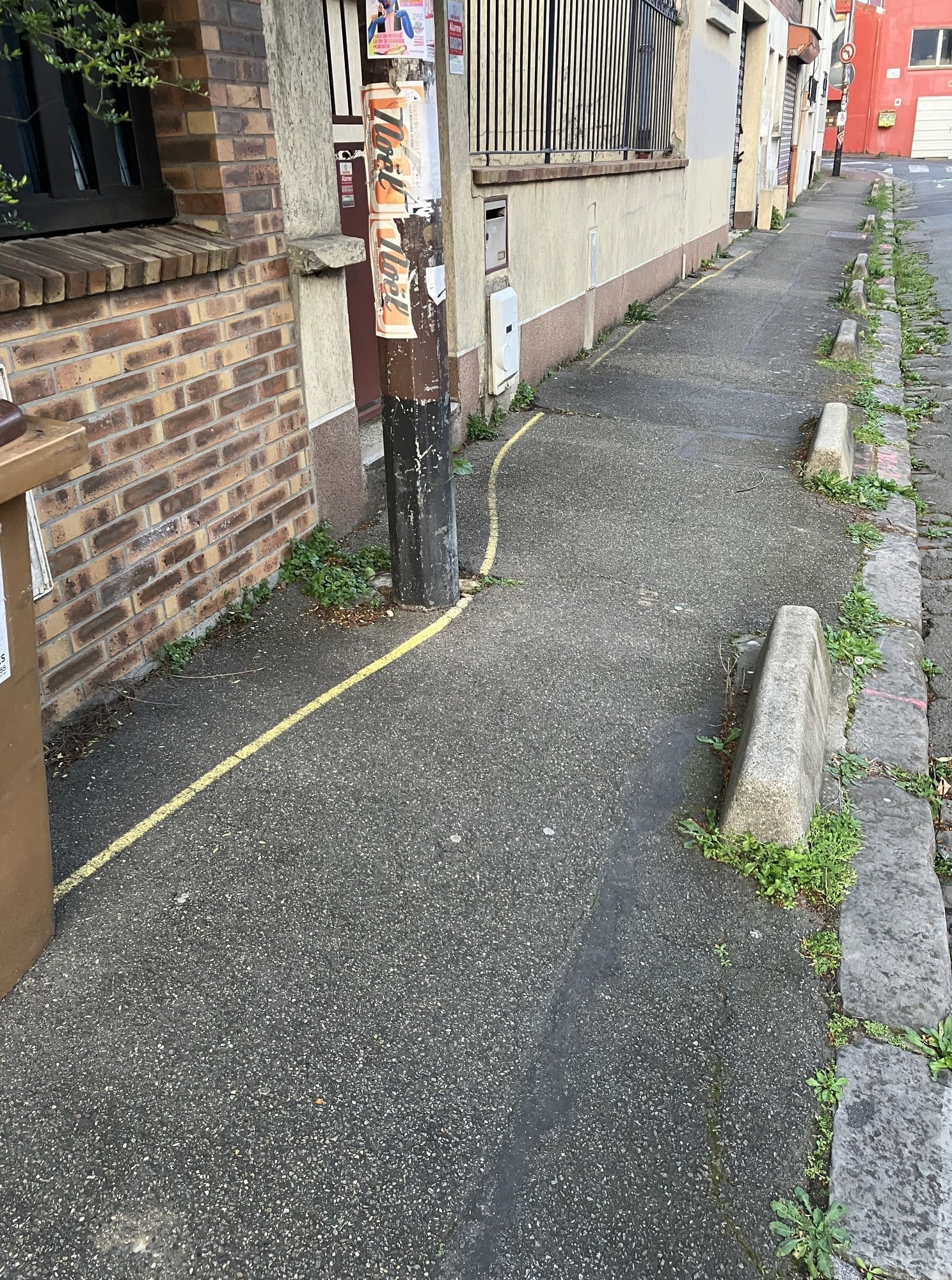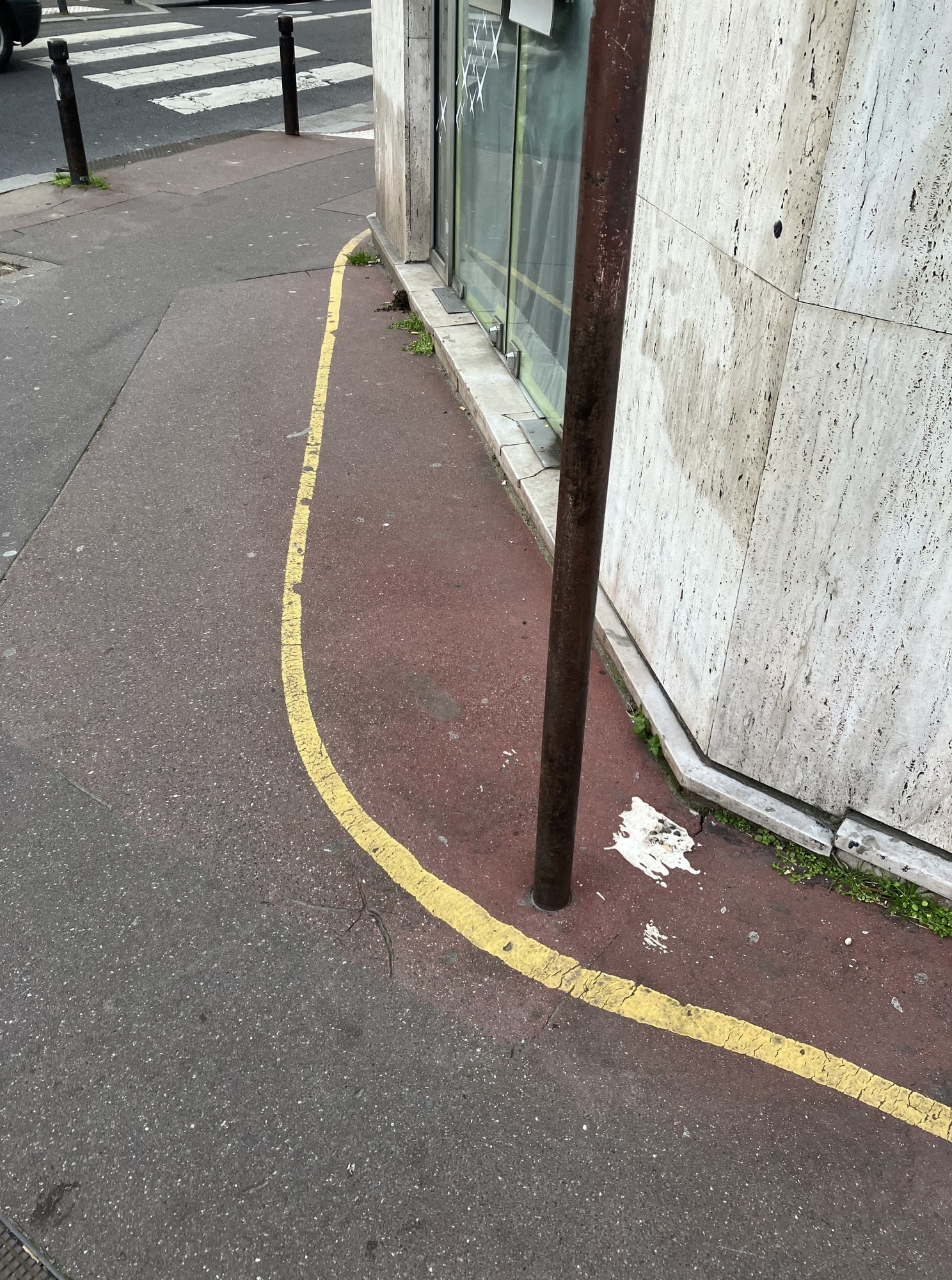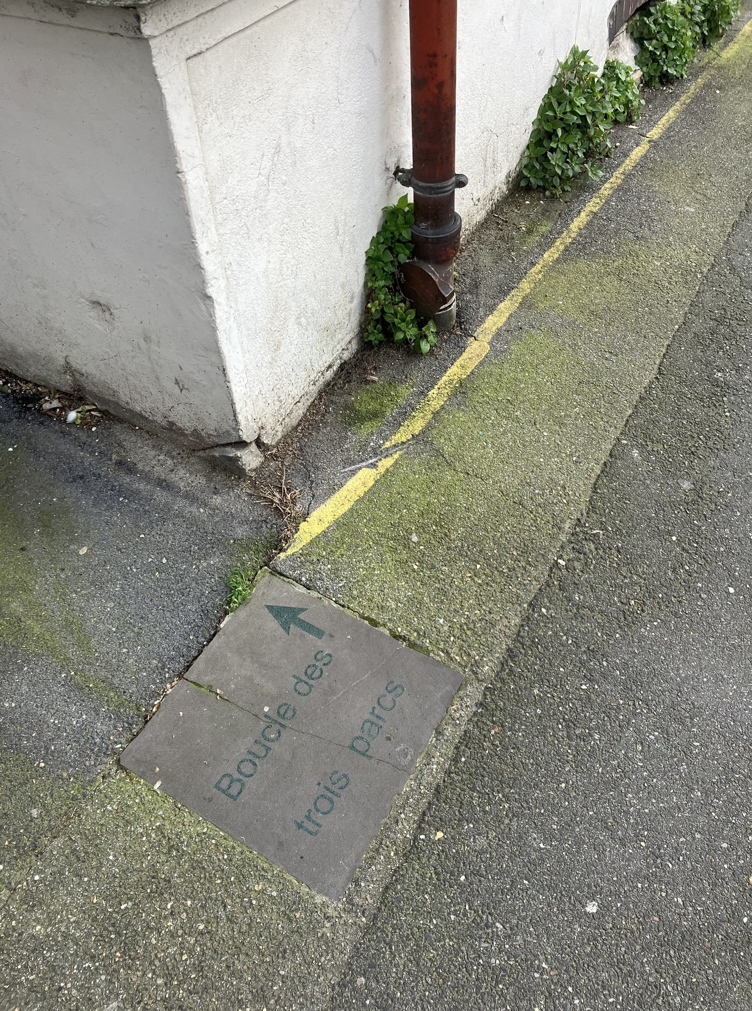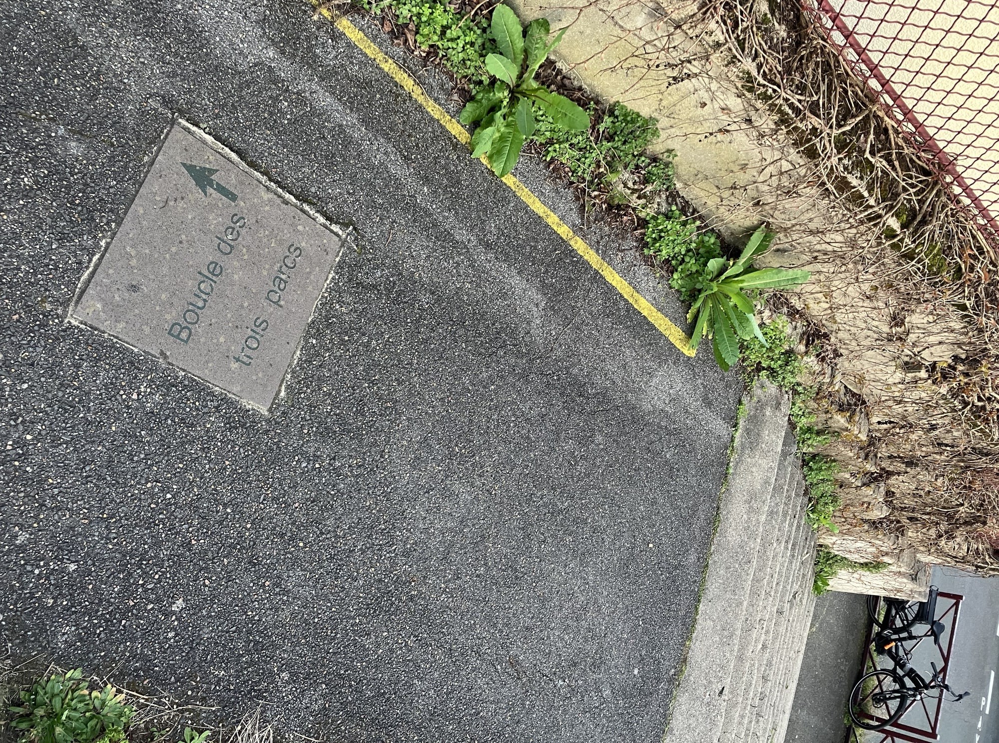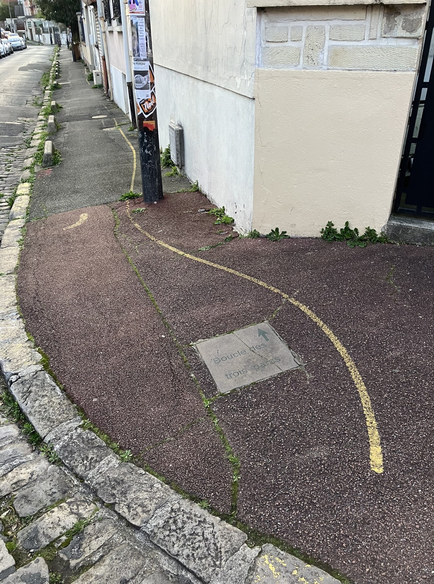 Il y a quelques temps je suis retombé sur un signe urbain que j’avais remarqué il y a dix ans quand je m’étais installé à Montreuil, sur lequel je m’étais un peu renseigné, mais je n’avais pas creusé plus loin. Le signe en question, c’est une ligne jaune, présente sur de nombreux trottoirs de la ville, et qui marquent une proposition de chemin : la Boucle des Trois Parcs.
