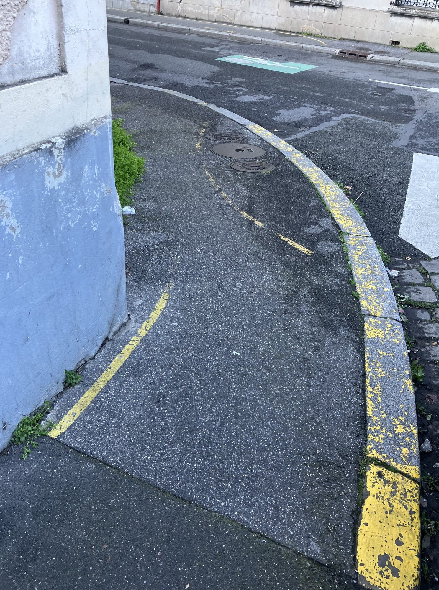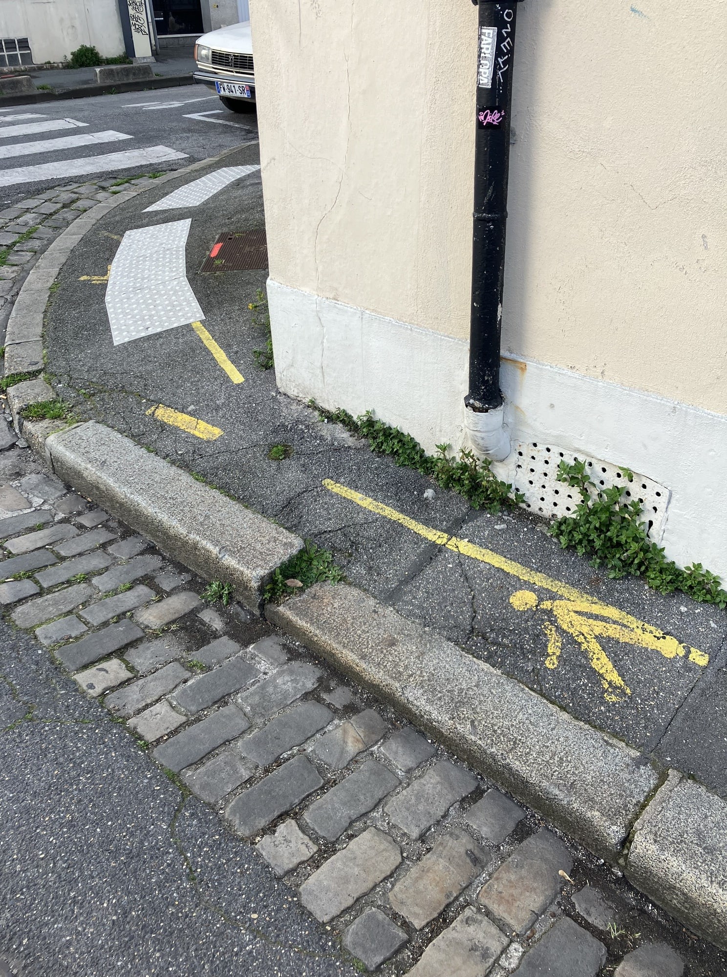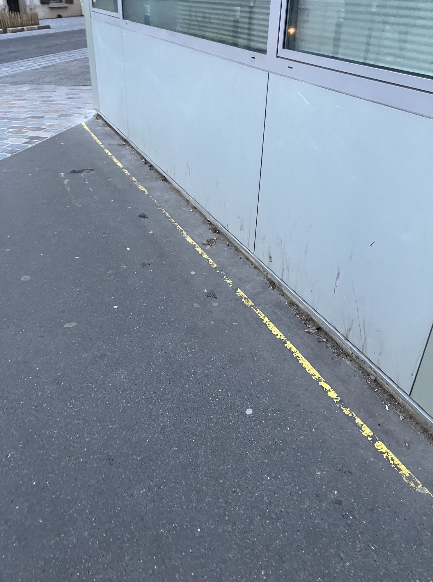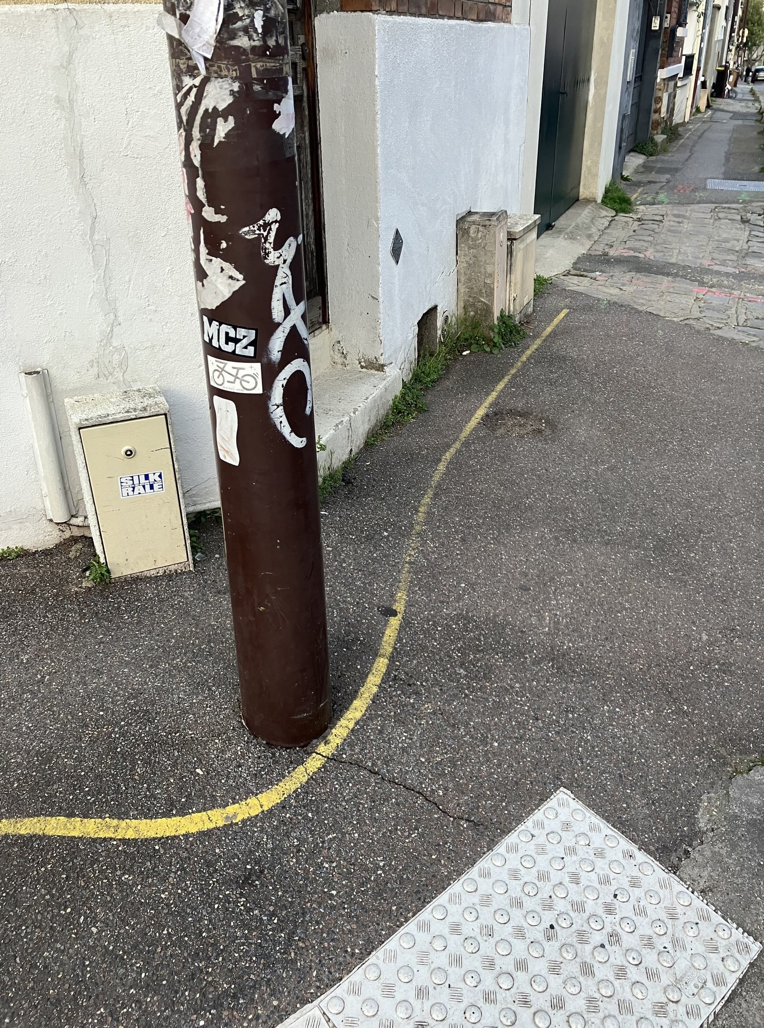Il y a quelques temps je suis retombé sur un signe urbain que j’avais remarqué il y a dix ans quand je m’étais installé à Montreuil, sur lequel je m’étais un peu renseigné, mais je n’avais pas creusé plus loin. Le signe en question, c’est une ligne jaune, présente sur de nombreux trottoirs de la ville, et qui marquent une proposition de chemin : la Boucle des Trois Parcs.